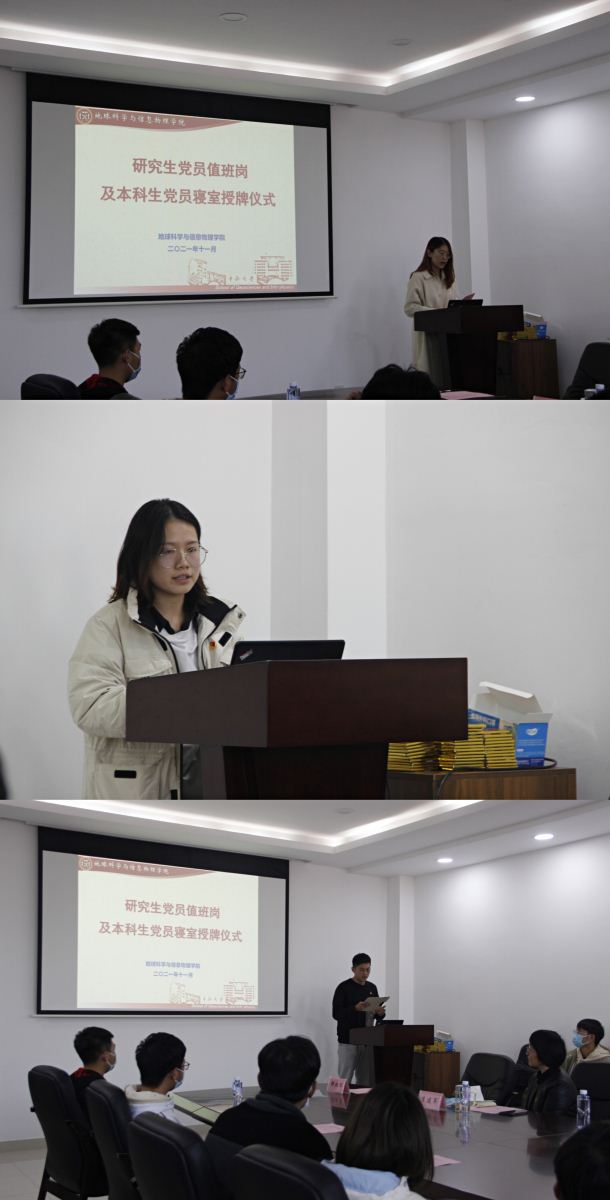 为了响应学校号召,进一步发挥员工党员的先锋模范作用,营造学院良好的学风、寝室氛围,促进党员工作透明化,更好地实现员工之间的互相督促和帮助。11月24日下午14:30,威廉希尔在地科楼214会议室郑重举行了研究生工作室党员值班岗及本科生党员寝室授牌仪式。出席本次授牌仪式的领导老师有,地信公司党委书记邵拥军教授,地信公司党委副书记李建军老师,威廉希尔研究生辅导员田可老师,威廉希尔团委书记刘琦老师,威廉希尔20级辅导员、地质资源系本科生支部书记杨晨雨老师,威廉希尔20级辅导员、地质工程系本科生支部书记杨通田老师。本次仪式由学院分团委书记刘琦老师主持,研究生及本科生党员代表共同参与。